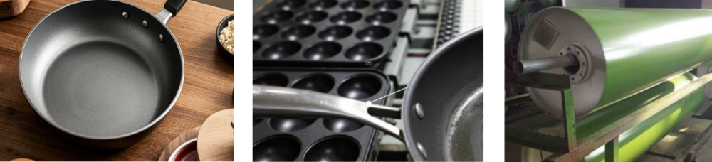 After being mixed with additives, it is sprayed onto the surface of cookware and sintered at high temperature to form a dense and smooth film, featuring non-stick, scratch resistance, high temperature resistance and easy cleaning.